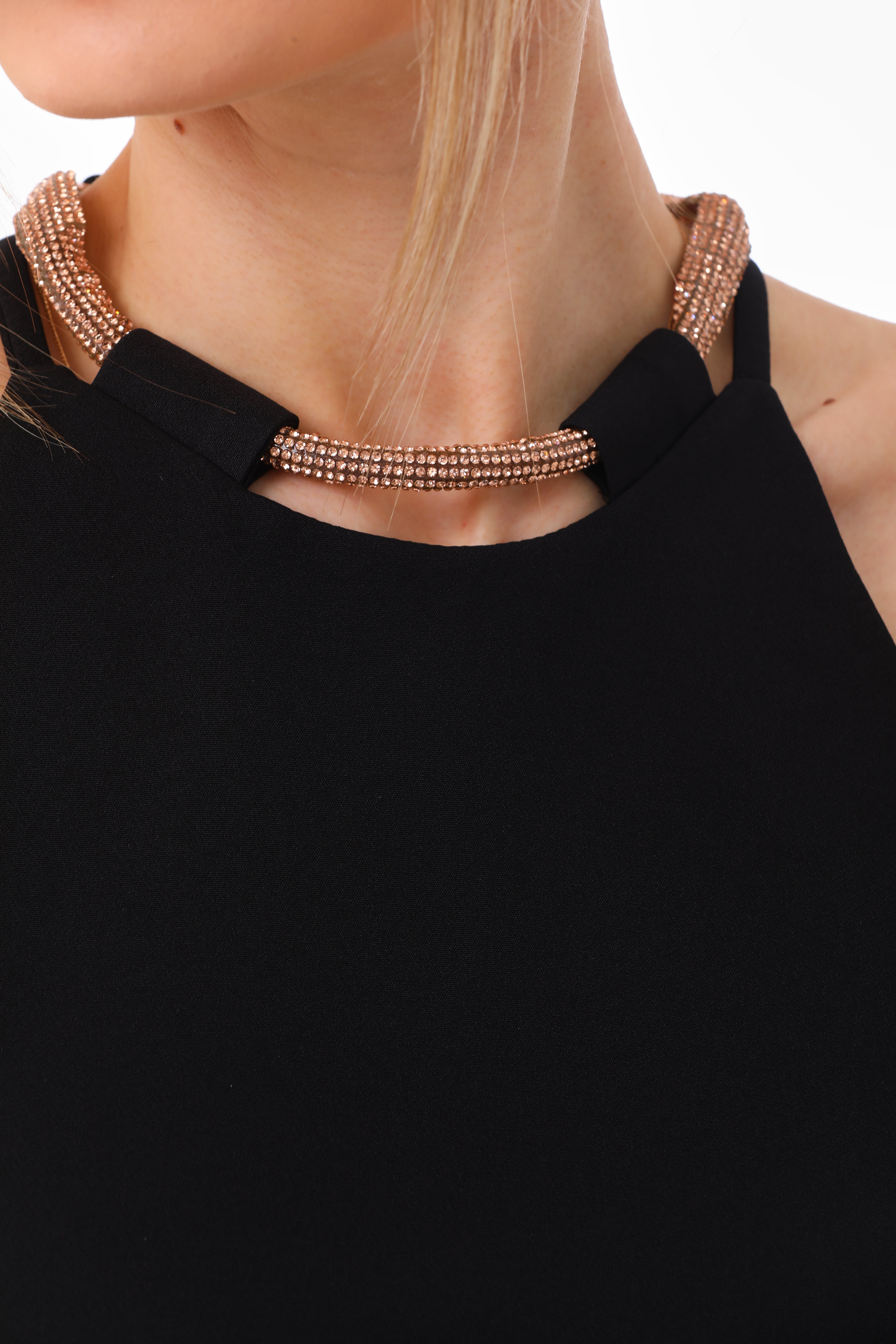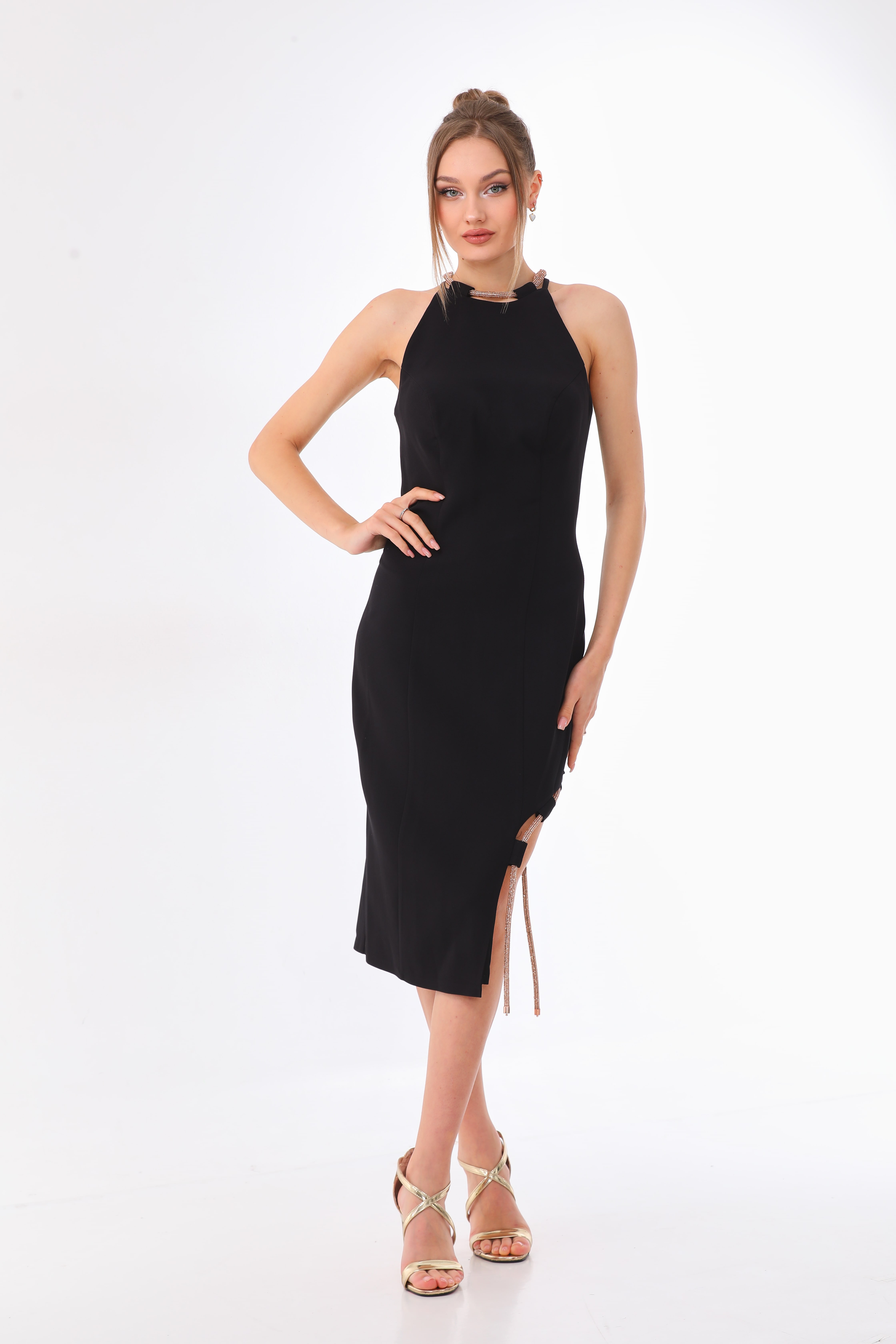 Make a statement in this shimmering Cocktail Dress with Golden Trim. The high neckline and cutout split are accentuated by a sparkling golden lining, while the sleeveless cut and bodycon silhouette create a sleek and elegant look that is sure to turn heads at any special occasion or night out.