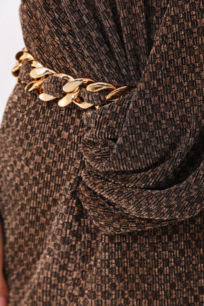 Indulge in an exquisite attire that exudes an aura of refinement and femininity with its striking and elegant style. The luxurious dress showcases a captivating blend of gold metallic finish and houndstooth pattern that emanates a grandiose presence. The ruched bodice is accompanied by a front slit that accentuates your silhouette while the modern twist of a gold chain belt adds a touch of edginess to the ensemble. Immerse yourself in the opulence of this lavish dress and leave an unforgettable impression on any occasion.
