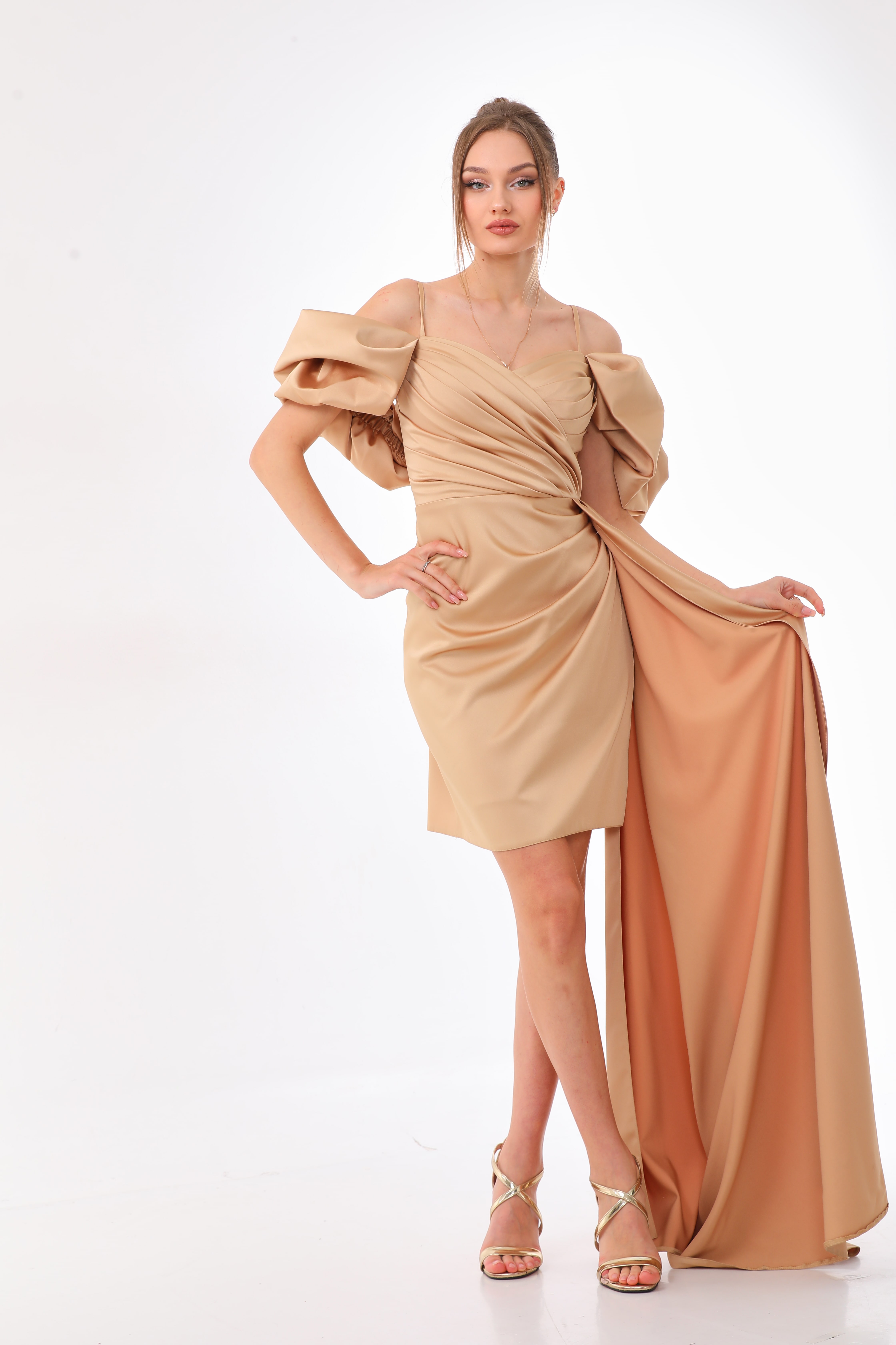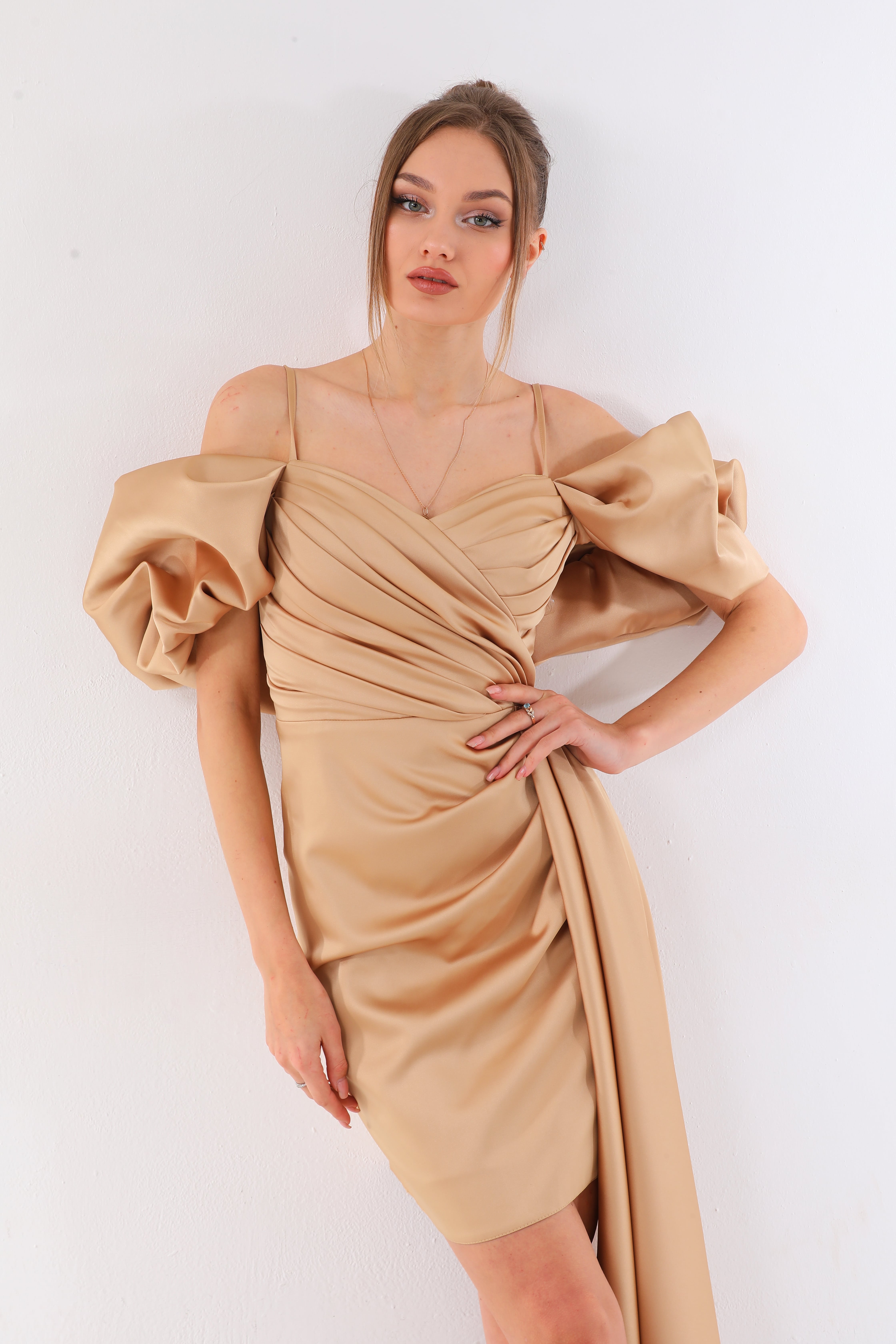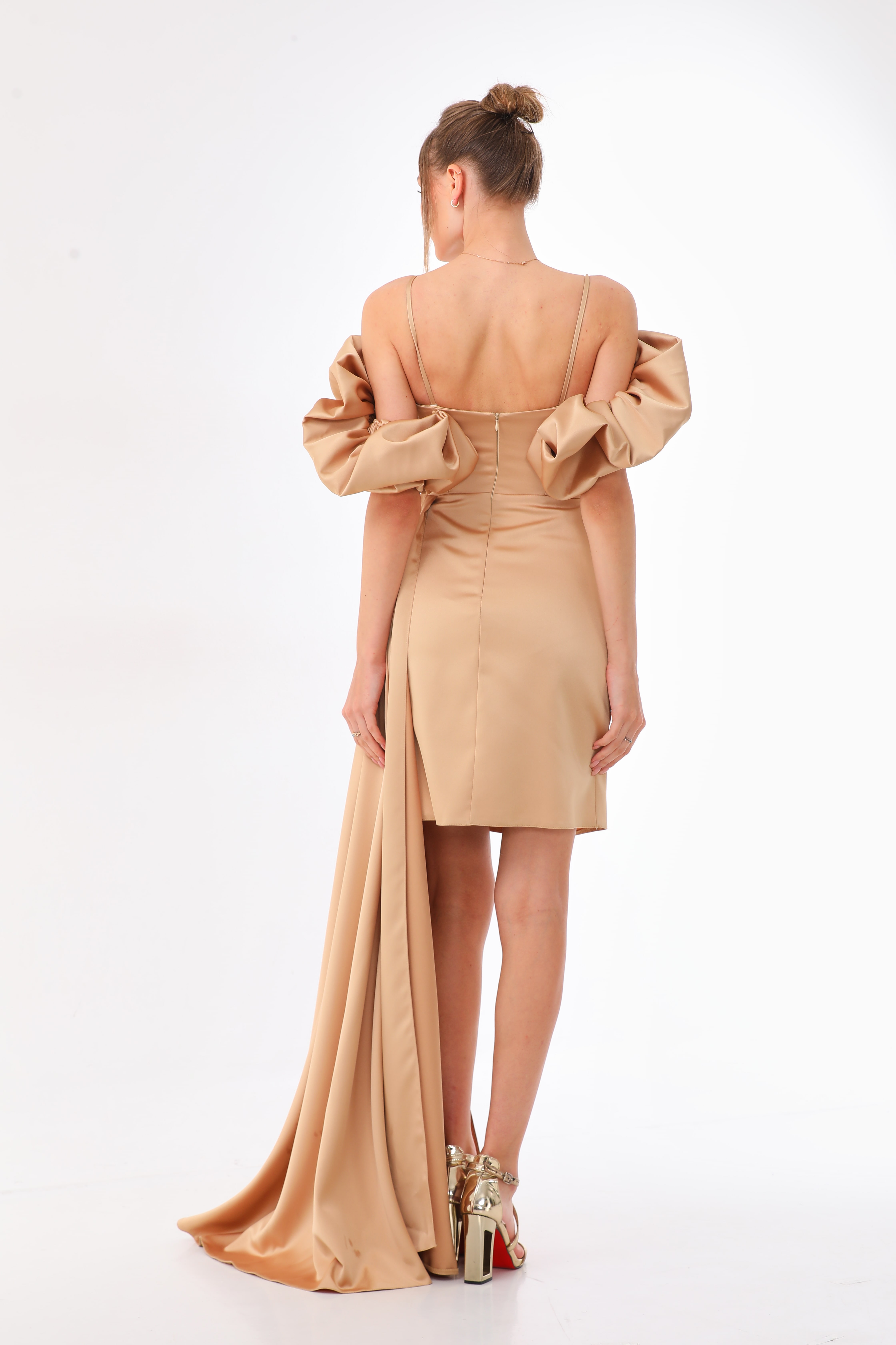 Specifications of Gold Satin Cold Shoulder Mini Dress