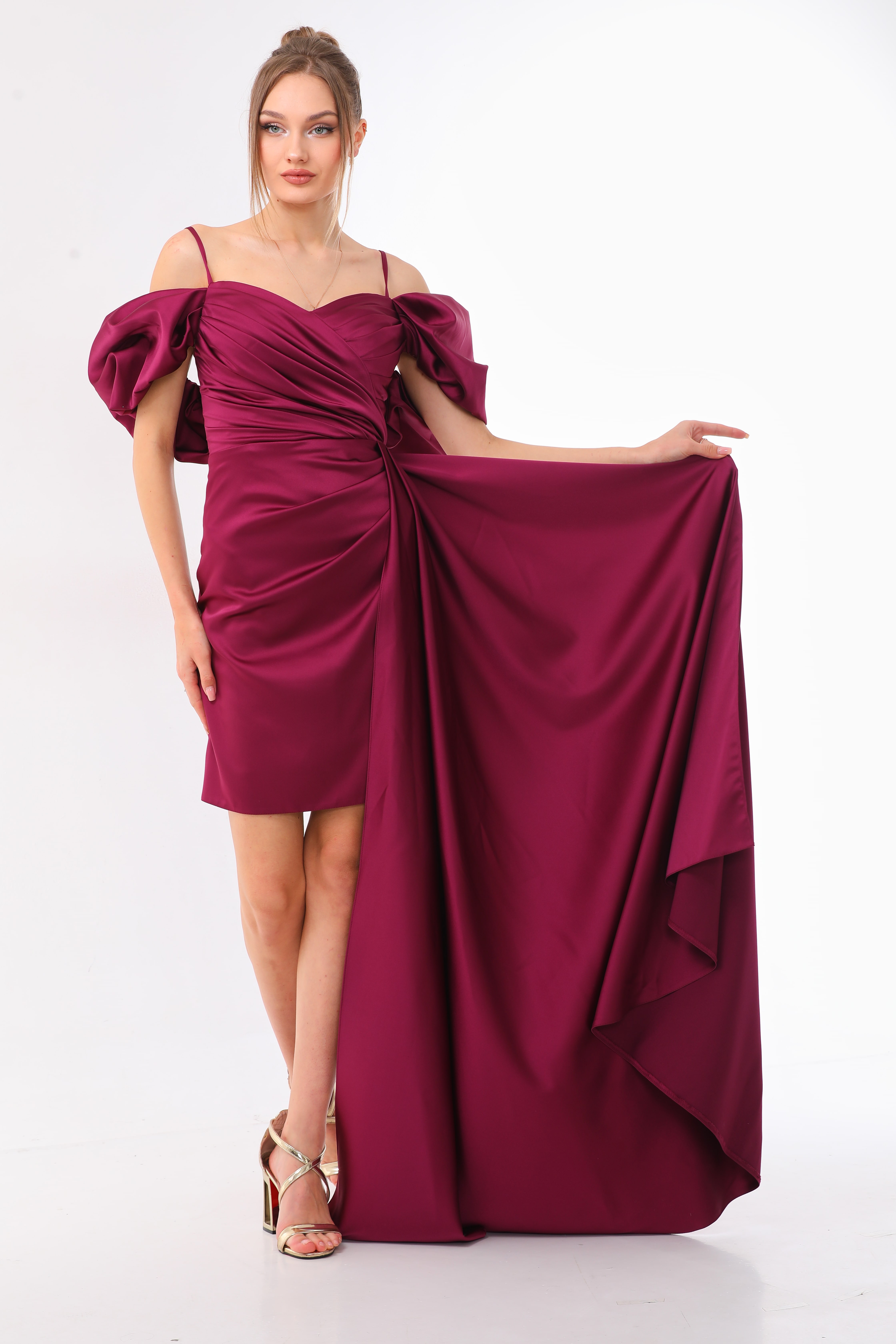 Looking for a dress that will make you feel like royalty? The Cold Shoulder Satin Mini Dress is just what you need! Its elegant design features a ruched bodice with a high-end satin fabric, puff sleeves, and a flattering sweetheart neckline.